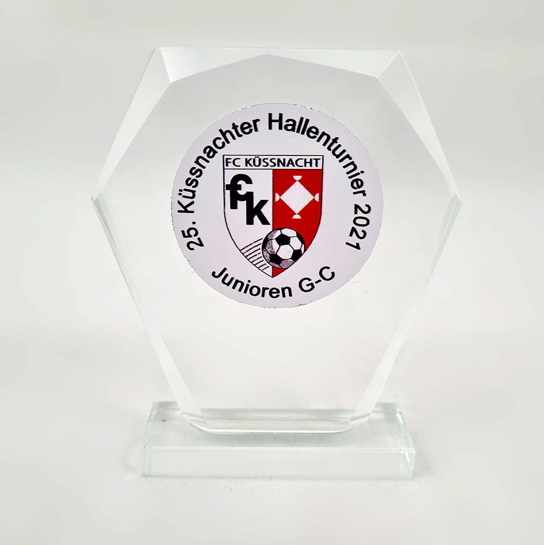 - Kristallglas-Trophäe auf silbernem Metallsockel, mit Lasergravur und UV-Print
