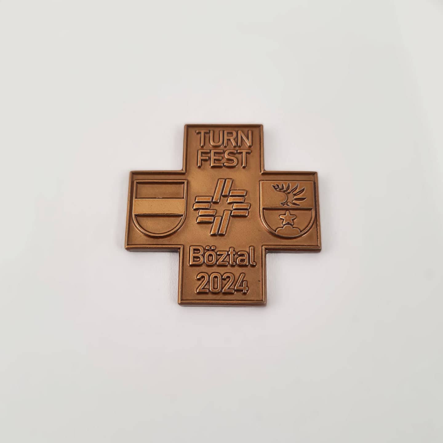 - Turnkreuz, gestanzt, gold mit farbig ausgelegter Schrift